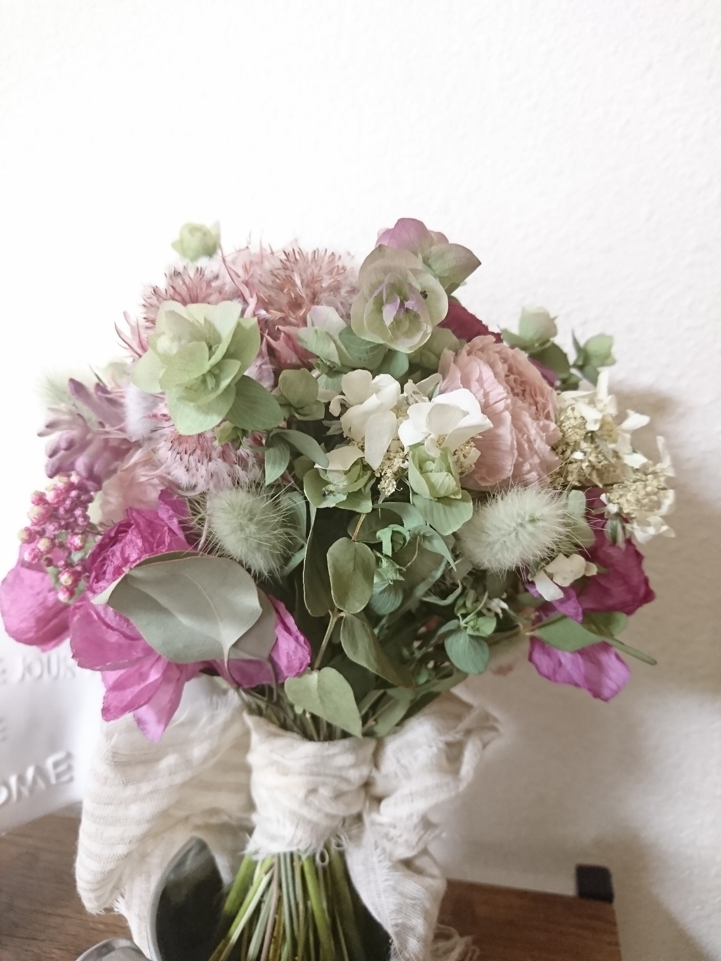 ドライフラワー全般に言えますが葉などが落ちやすいのでお取り扱いは優しくお願いいたします。